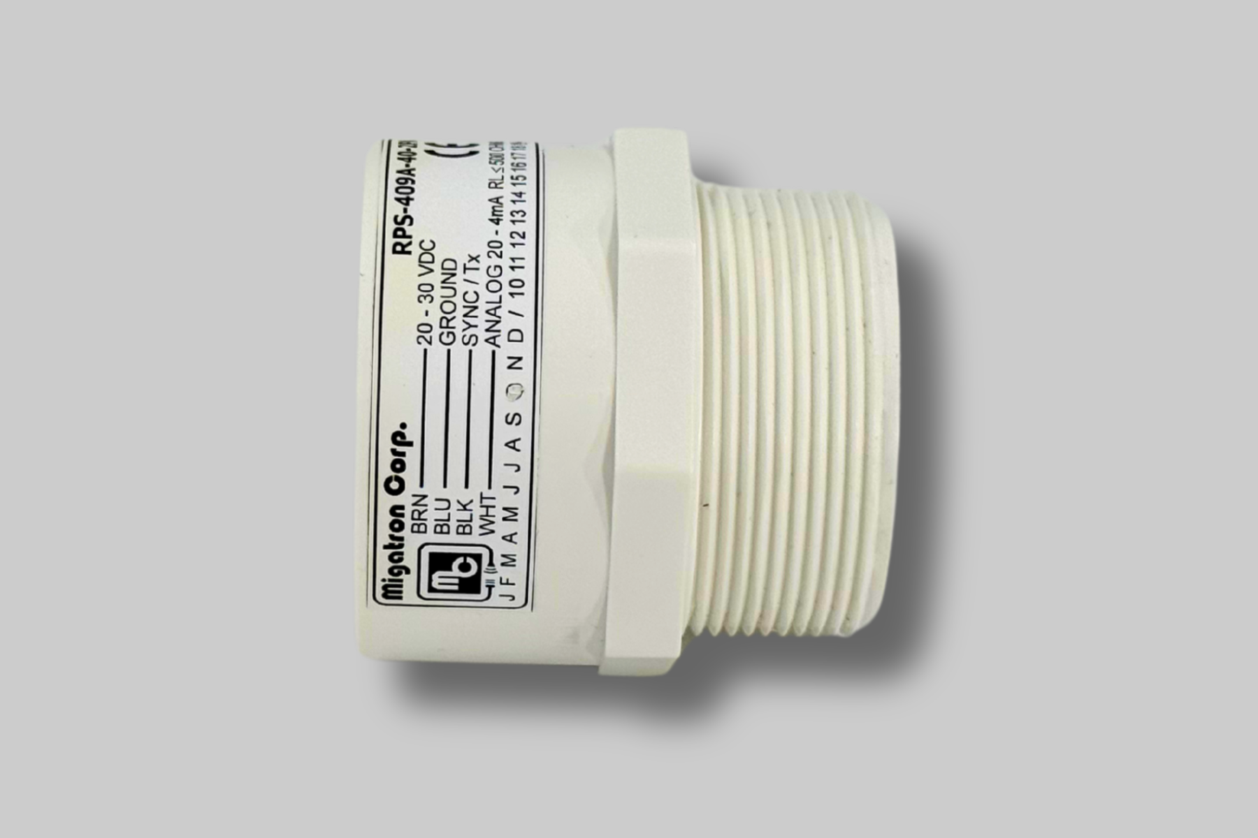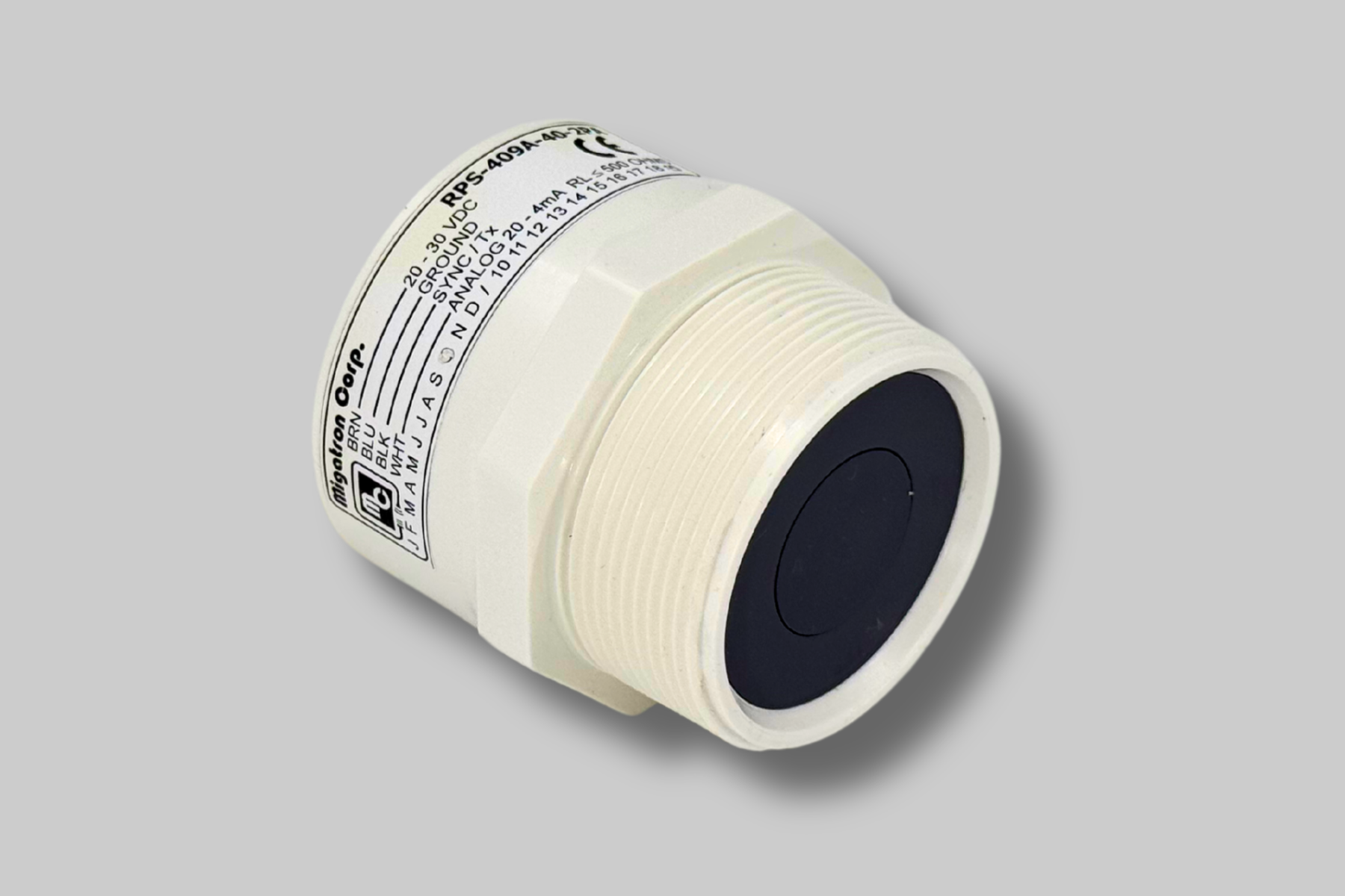 The RPS-409A-2P analog ultrasonic sensor is a self contained sensor in a PVC housing with 2″ NPT mounting threads. It is powered by 20 – 30VDC with reverse polarity protection.